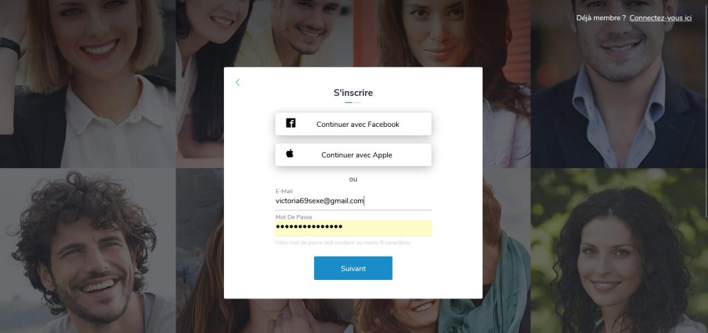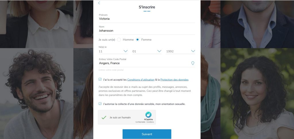 Pour commencer, le site de rencontre vous demande de remplir deux formulaires. L’opération ne prend pas plus de 5 minutes, car elle consiste à indiquer la date de naissance, le sexe et un adresse e-mail.