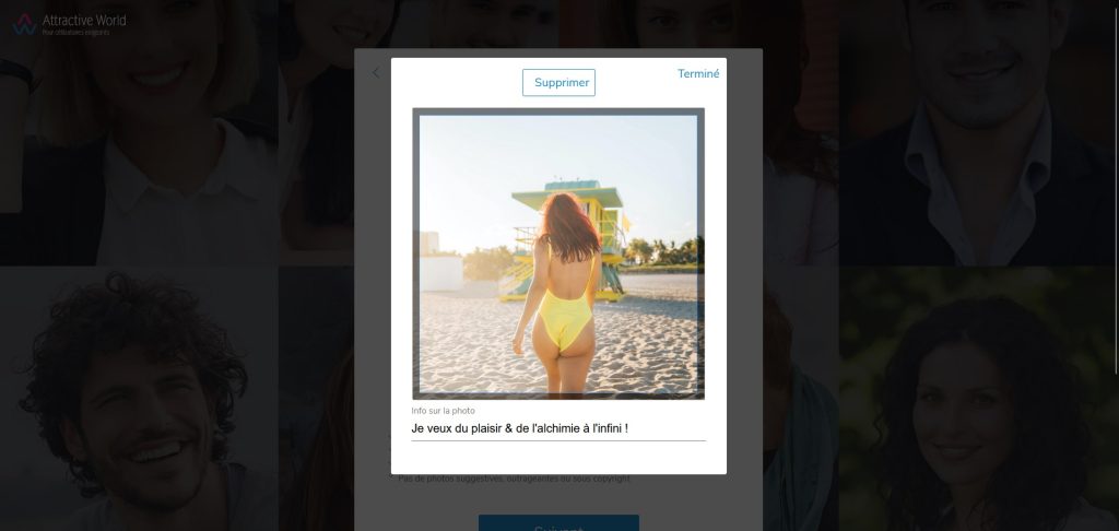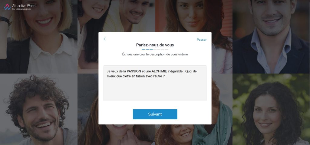 Pour vous inscrire, vous devez fournir diverses informations telles que vos passe-temps, votre orientation sexuelle (hétérosexuelle, gay ou lesbienne) et votre situation professionnelle. Vous serez ensuite amené à répondre à un ensemble de cinq questions portant sur vos préférences dans la vie, vos motivations, vos attentes à l'égard d'Attractive World, et d'autres aspects. Il est impératif de soigner vos réponses en utilisant une écriture de qualité et en veillant à l'orthographe. N'omettez pas de télécharger une ou plusieurs photos sur votre profil.