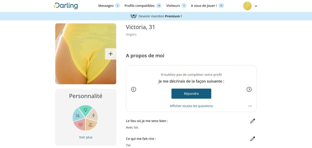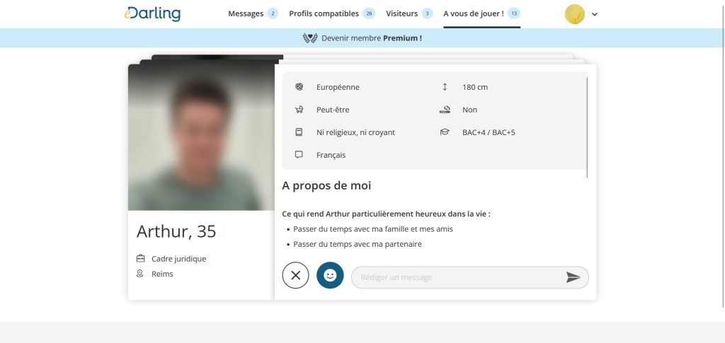 L'utilisation d'eDarling sans souscrire à un abonnement premium est soumise à des limitations. En l'absence d'abonnement, il n'est pas possible d'envoyer des messages, et les photos des membres sont floutées. Les informations, préférences et commentaires qui composent le reste du profil restent accessibles à tous. Les profils sont généralement bien renseignés et fournissent une bonne compréhension des personnes qui les ont créés. Tous les membres, qu'ils aient souscrit un abonnement payant ou non, peuvent consulter les résultats du test de personnalité. Cela peut s'avérer utile pour se faire une première idée des personnes susceptibles de correspondre à vos attentes. Par exemple, si Zazie est décrite comme très prudente, introvertie et méthodique, vous pourrez déjà avoir un aperçu de sa personnalité et envisager qu'elle puisse être votre âme sœur.