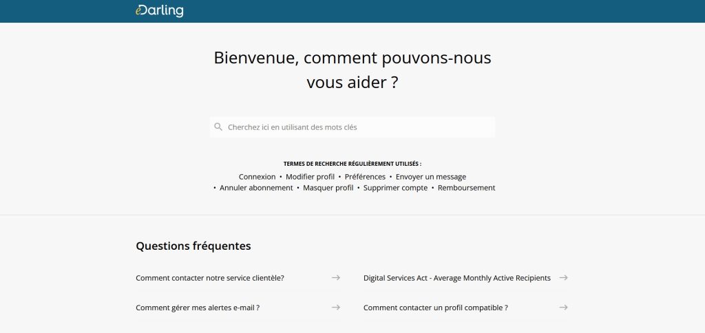 eDarling met à votre disposition une Foire Aux Questions (FAQ) où vous pouvez consulter des réponses à l'ensemble de vos interrogations. En cas d'absence de solutions dans la FAQ, le service clientèle est prêt à vous assister par téléphone : 04 82 53 04 61 (du lundi au vendredi, de 9h à 18h). Vous pouvez contacter l'équipe en composant le numéro 0825 2109 64. Le tarif de l'appel est de 0,15 euro par minute à partir d'un téléphone fixe. Le mail du groupe est info@edarling.fr.