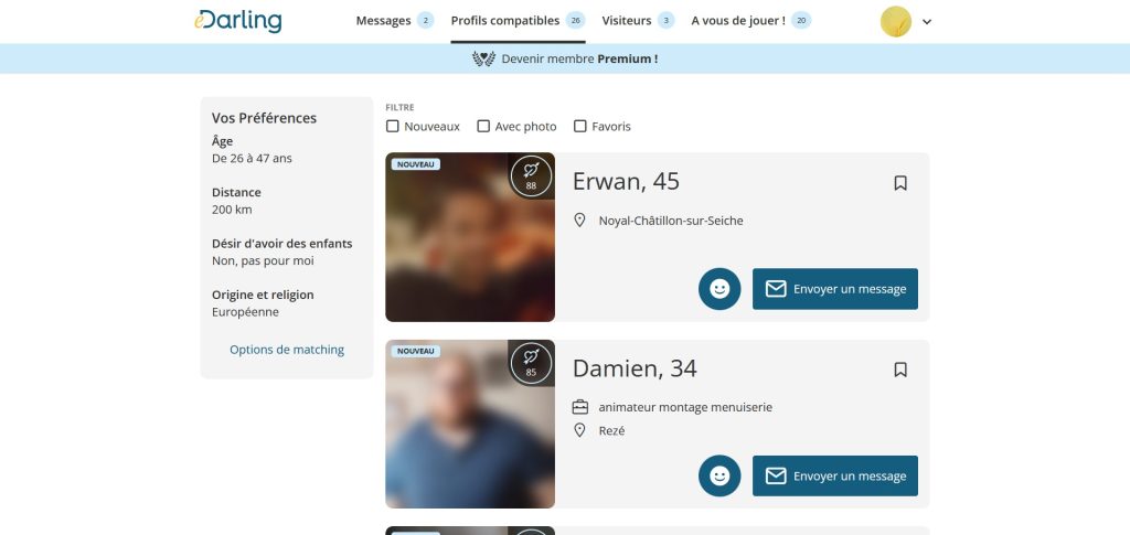 Il n’est pas surprenant de trouver dans sa liste de profils proposés des célibataires vous ressemblant, ou vous complétant. Vous pouvez par exemple découvrir des abonnés ayant des centres d’intérêts communs ou répondant à vos critères physiques/professionnels. Dommage qu’il soit impossible de connaitre les résultats de son test en restant dans le mode gratuit. La majorité des membres sur eDarling sont des célibataires sérieux, tandis que le reste est peu motivé. Il n’est pas rare de voir des faux-profils ou des comptes sans photo sur la plateforme. Faites attention pour éviter de tomber sur des personnes ayant un but autre que la thématique du site. Elles sont plus orientées vers les rencontres coquines que sérieuses.