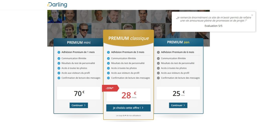 eDarling met à votre disposition une formule basique gratuite pour se familiariser avec la plateforme, mais limitée. Elle vous permet de vous inscrire, de répondre au questionnaire et de découvrir le fonctionnement global de la plateforme. Elle vous autorise à télécharger une photo de profil et de trouver les profils proposés suite au test de personnalité.