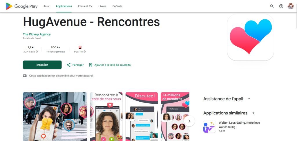 Hugavenue est disponible à la fois sur l'App Store et sur Google Play. La dernière mise à jour de l'application date du 15 juin 2020, et elle nécessite environ 60 Mo d'espace. Elle a déjà été téléchargée plus de 500 000 fois, ce qui en fait un choix très prisé pour les rencontres en li