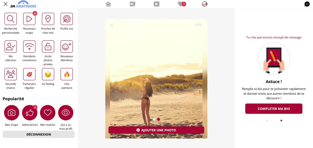 JM Asiatiques est un site de rencontres coquines destiné aux femmes asiatiques, offrant une inscription gratuite pour tous. L'inscription gratuite ne donne pas accès à toutes les fonctionnalités du site. Pour communiquer avec d'autres membres, vous devrez souscrire à un abonnement premium ou opter pour l'offre d'essai.