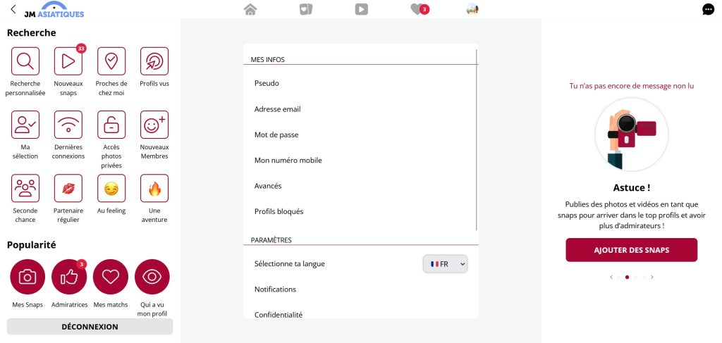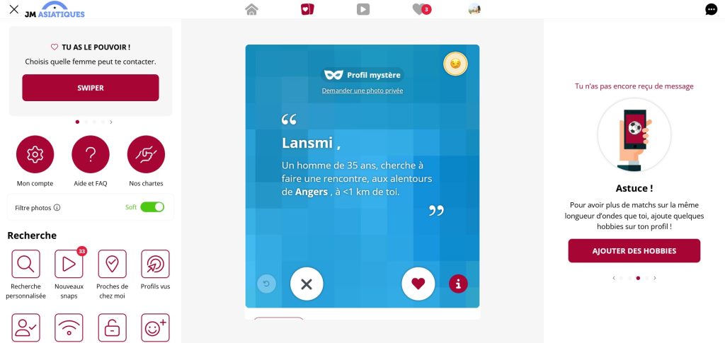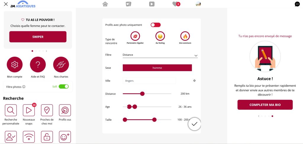 Concernant la conception du site, son design est épuré et intuitif, facilitant la découverte de toutes les informations nécessaires sans être submergé par une multitude de données. La navigation sur le portail est conviviale et peut être maîtrisée en quelques minutes seulement. Concernant les options de recherche, elles sont particulièrement détaillées, permettant de spécifier divers critères pour obtenir une liste de profils qui pourraient vous intéresser, y compris des critères tels que l'âge, la distance, la ville, et bien d'autres. Il n'y a aucune raison d'hésiter ; plongez sans attendre dans l'univers de J&M Asiatique !