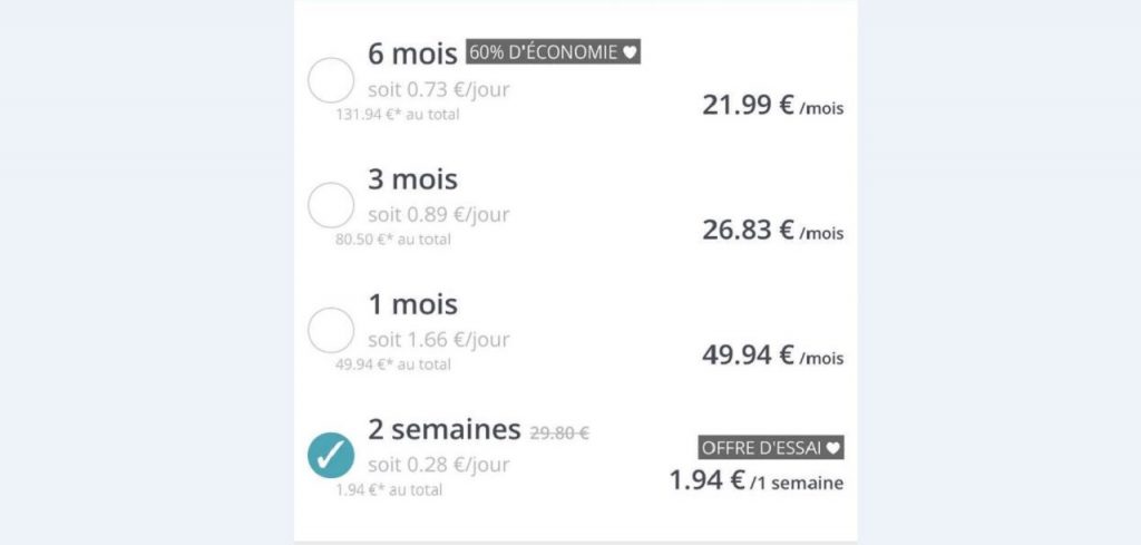 - La période d’essai de 2 semaines : 1,94 €/semaine