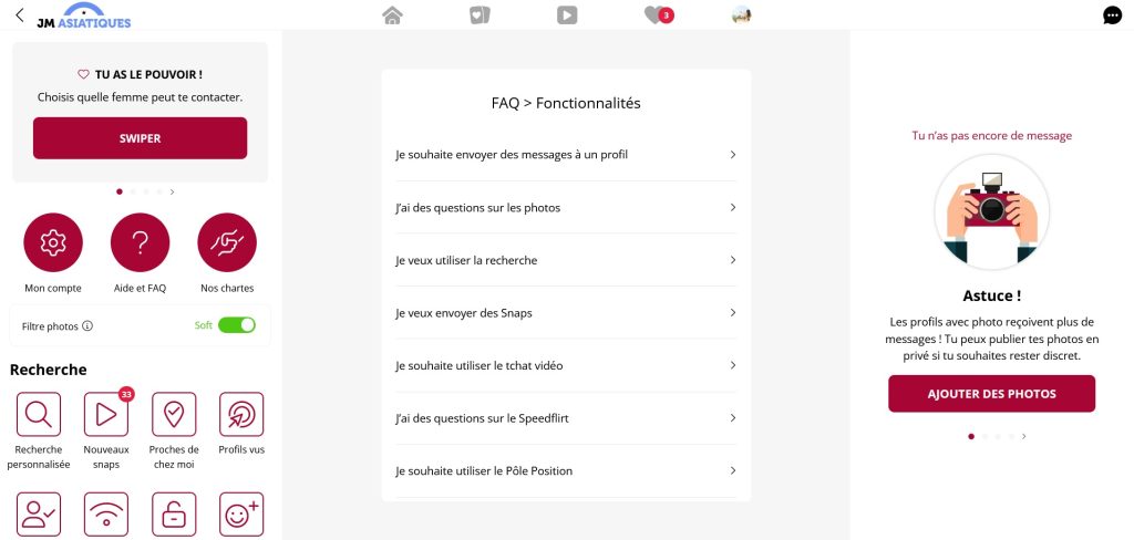 Par rapport à l'ambiance, elle se caractérise par une grande décontraction. Alors, n'hésitez pas à laisser de côté vos inhibitions. Les membres du site partagent un objectif commun : maximiser leur plaisir avec des partenaires asiatiques passionnés. Côté fonctionnalités, elles s'apparentent à celles d'un réseau social, facilitant ainsi la communication avec d'autres membres.