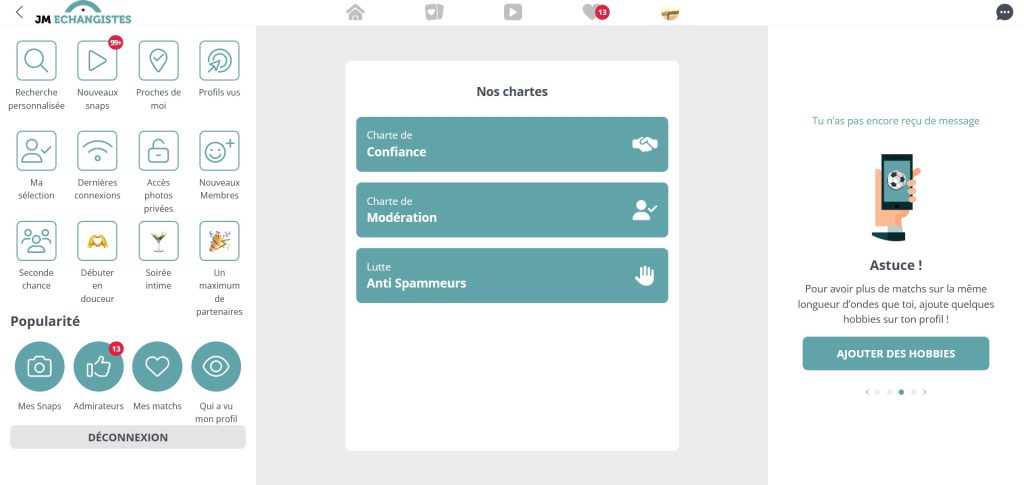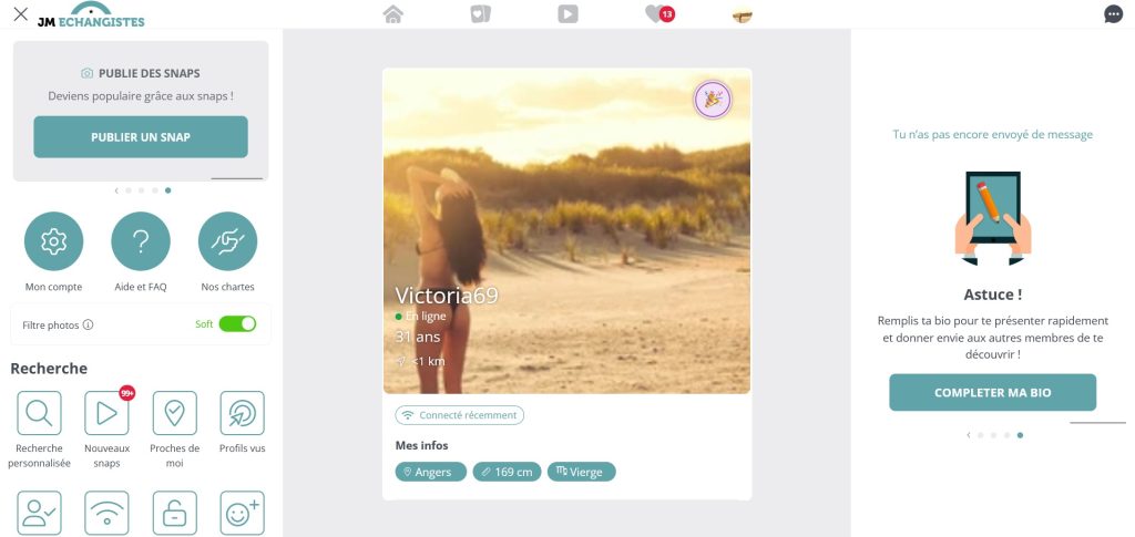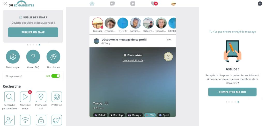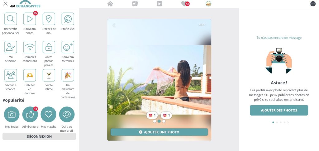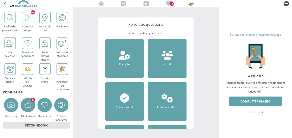 Afin de tester le site, je me suis inscrit en tant que célibataire à la recherche de couple désireux de faire du candaulisme. Les étapes d’inscription ont été rapides et simples, comme pour tous les sites Jacquie et Michel que j’ai pu tester. Une autre similarité, c’est le nombre d’adhérents particulièrement élevé. Cela s’explique sûrement par la notoriété et la crédibilité de la marque. Il m’a fallu près de quatre jours pour dénicher mes premières conversations. La plupart des personnes qui entament les discussions sont les femmes.
