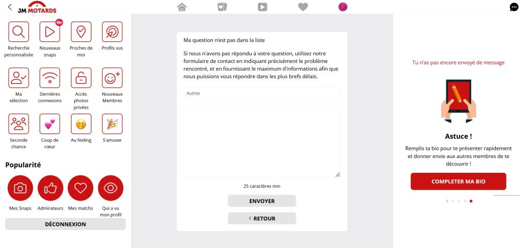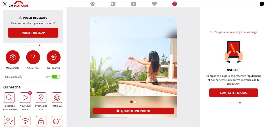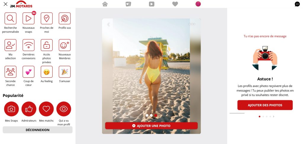 En règle générale, vous avez la possibilité de télécharger plusieurs photos sur votre profil. JM Motards offre une fonctionnalité qui vous permet d'ajouter des photos privées et de les partager uniquement avec les personnes que vous avez préalablement approuvées. Contrairement à certains autres sites de rencontre, JM Motards ne propose pas de bouton d'urgence pour rediriger les utilisateurs vers un autre site en cas de besoin.