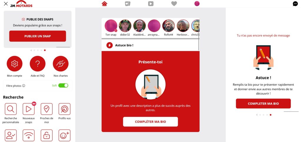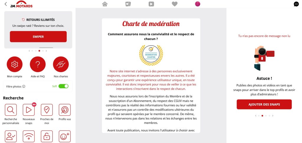 La prise en main de la plateforme de rencontres Jacquie & Michel Motard est à la fois simple et rapide grâce à une interface parfaitement conçue. Le site présente une mise en page similaire à un réseau social, rappelant Facebook, ce qui le rend très moderne et convivial pour les utilisateurs. La simplicité d'utilisation est mise en avant avec des fonctionnalités efficaces telles que la messagerie et le chat en ligne. Il est possible de partager vos états d'esprit et d'ajouter des profils à votre liste d'amis. Cependant, concernant l'apparence du site, elle reste assez basique, et certains auraient peut-être préféré une touche plus personnalisée, spécifiquement axée sur le thème de la moto.