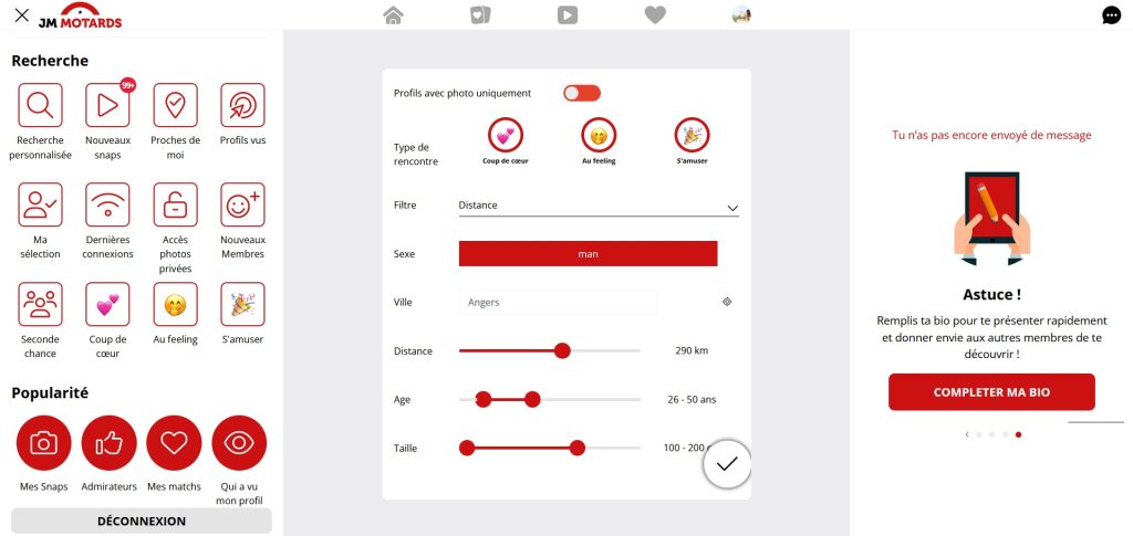 Sur JM Motards, vous avez la possibilité de définir vos critères de recherche, notamment le genre, l'âge, la présence de photos et la disponibilité en ligne. Ce site chaud propose des options de recherche avancée pour des critères plus spécifiques.